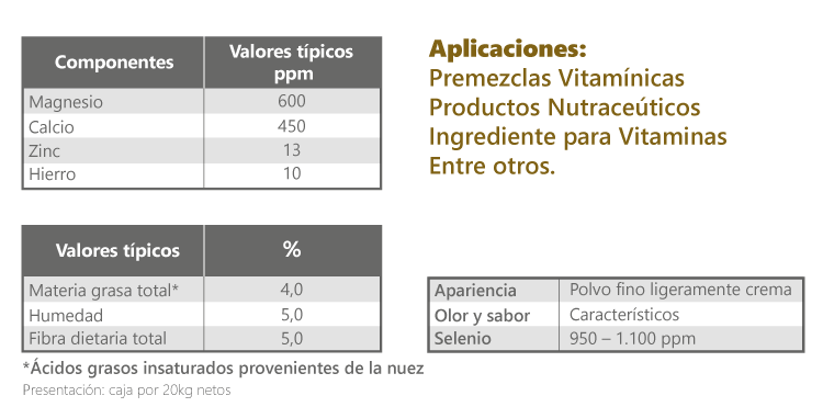 Estas semillas por sus propiedades derivadas del contenido de Selenio Natural como Selenometionina y Selenocisteína, aminoácidos esenciales, aceite con ácidos grasos insaturados y oligoelementos entre otros componentes, extraemos SelenaturMag, una harina con una concentración promedio de 1.000 ppm de Selenio Natural.